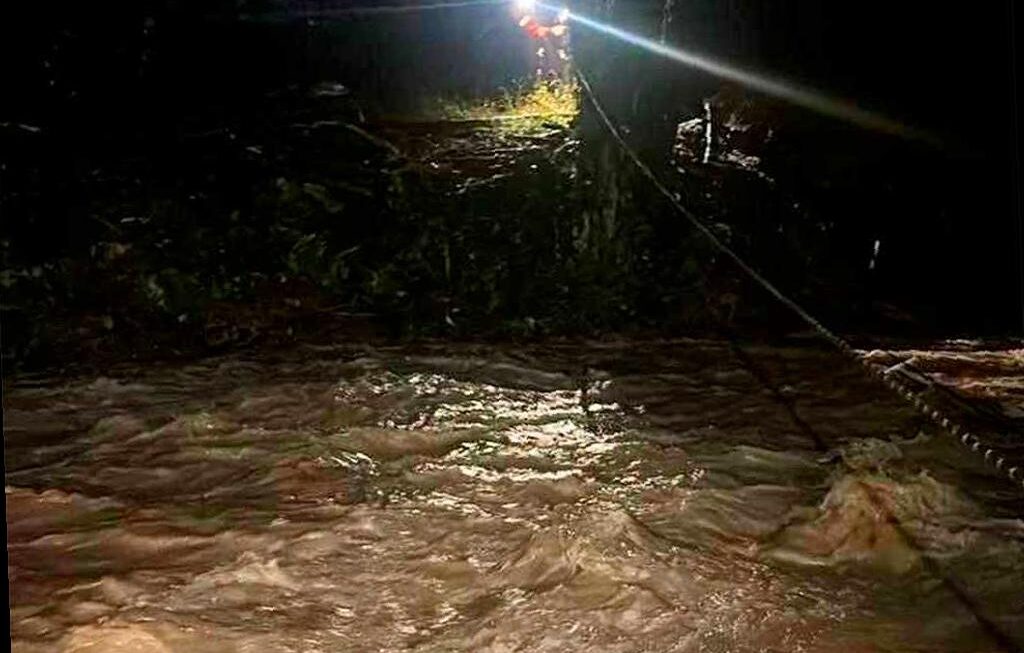 В Сочи местный житель попал в беду из-за неожиданного подъема уровня воды в реке Цанык. Вечером 10 октября он решил пересечь реку на своем автомобиле, но машина была затянута водой. Мужчина оказался в ловушке, окруженный водой с двух сторон. К счастью, спасатели прибыли на место и с помощью специального снаряжения эвакуировали его в безопасное место, где его уже ждали близкие. Подробности происшествия можно найти здесь. На фото: спасатели работают на берегу реки.